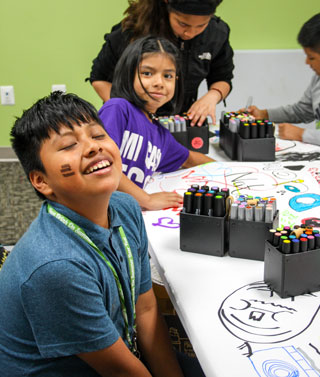 As they worked through interactive activities to build a collective mural, our students were exposed not only to how fun drawing can be, but how valuable visual expression can be when communicating through words is difficult. For one of our 5th grade students, it’s a regular struggle for her to put how she’s feeling into words, or to find ways of working through her anxiety. After an especially hard beginning hour of Kids Club, Mariana* walked into the 2nd day of the workshop feeling frustrated and discouraged. As she worked with the markers, her disposition changed and she began to relax and engage. At the end of the day, she came up to me and said, “Ms. Marissa that was really helpful. I don’t know why, but drawing helped me calm down and refocus. I feel better.”