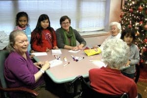 It really did work out, against all odds. I took one look at that room and I thought, aye yi yi! Our 5th grade Josefina is absolutely fearless and full of love. She is willing and open. Our tablemates were the smiling lady who seemed as if she couldn’t talk, but who eventually did somewhat. Angelica told me that the lady even said something in Spanish, but then didn’t say anymore. She seemed content to watch the girls make their cards. Josefina tried to help her hold a marker herself, but she had no grip. I was busy talking to a woman who seemed very uncomfortable. She basically told us that she couldn’t accommodate us and urged us to move on. As I engaged her in conversation, different children would stop by. Pati just walked up to her and in the brightest voice said, “Hello! How are you?” My lady just beamed and smiled. It was as if she remembered how to be happy. Raul gave her a card and smiled at her, then Julio came up and let me introduce him and talk a little, then Omar came up and actually knelt down so the lady could look into his face. She really liked Omar and complimented him on his curly hair. He graciously said “thank you” and then I asked him to tell her about what he does at Kids club. He explained that he was learning to be a leader. The lady asked him what he had to do. He explained that he helped the younger kids with their homework and reading. She said, “that must make you feel good that you know so much.” She kinda came to life. This was her most coherent conversation. Then Josefina came over, gave her the card she made and read it to her. It said something along the lines of: “I wish you a very Merry Christmas. Remember, Jesus loves you. And don’t you forget it!” The woman listened, but didn’t really respond. Then a little later she picked up the card and smiled and said “and don’t you forget it.”