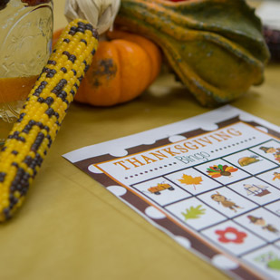 During the celebration students practiced their English by playing a game of Thanksgiving-themed Bingo. After filling their boards with items like cooked turkey, live turkey, an orange leaf, and a green leaf, three hands went up exclaiming, “Bingo!” The winners took home the beautiful centerpieces created by a volunteer from RCC.